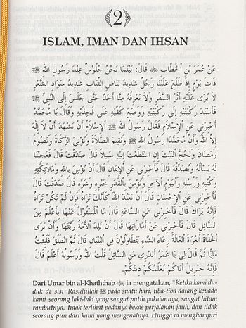 “Suatu ketika, kami (para sahabat) duduk di dekat rasululah S.A.W. Tiba-tiba muncul kepada kami seorang lelaki mengenakan pakaian yang sangat putih dan rambutnya amat hitam. Tak terlihat padanya tanda-tanda bekas perjalanan, dan tak ada seorang pun di antara kami yang mengenalnya. Ia segera duduk di hadapan nabi, lalu lututnya disandarkan kepada lutut nabi dan meletakkan kedua tangannya di atas kedua paha nabi,