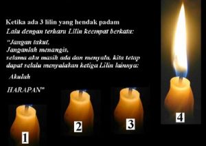 Si bocah pun mulai menangis. Tapi lilin keempat berkata,“Jangan khawatir, senyampang aku masih menyala, kita bisa menyalakan kembali nyala api lilin-lilin lainnya, aku adalah HOPE (Harapan).”